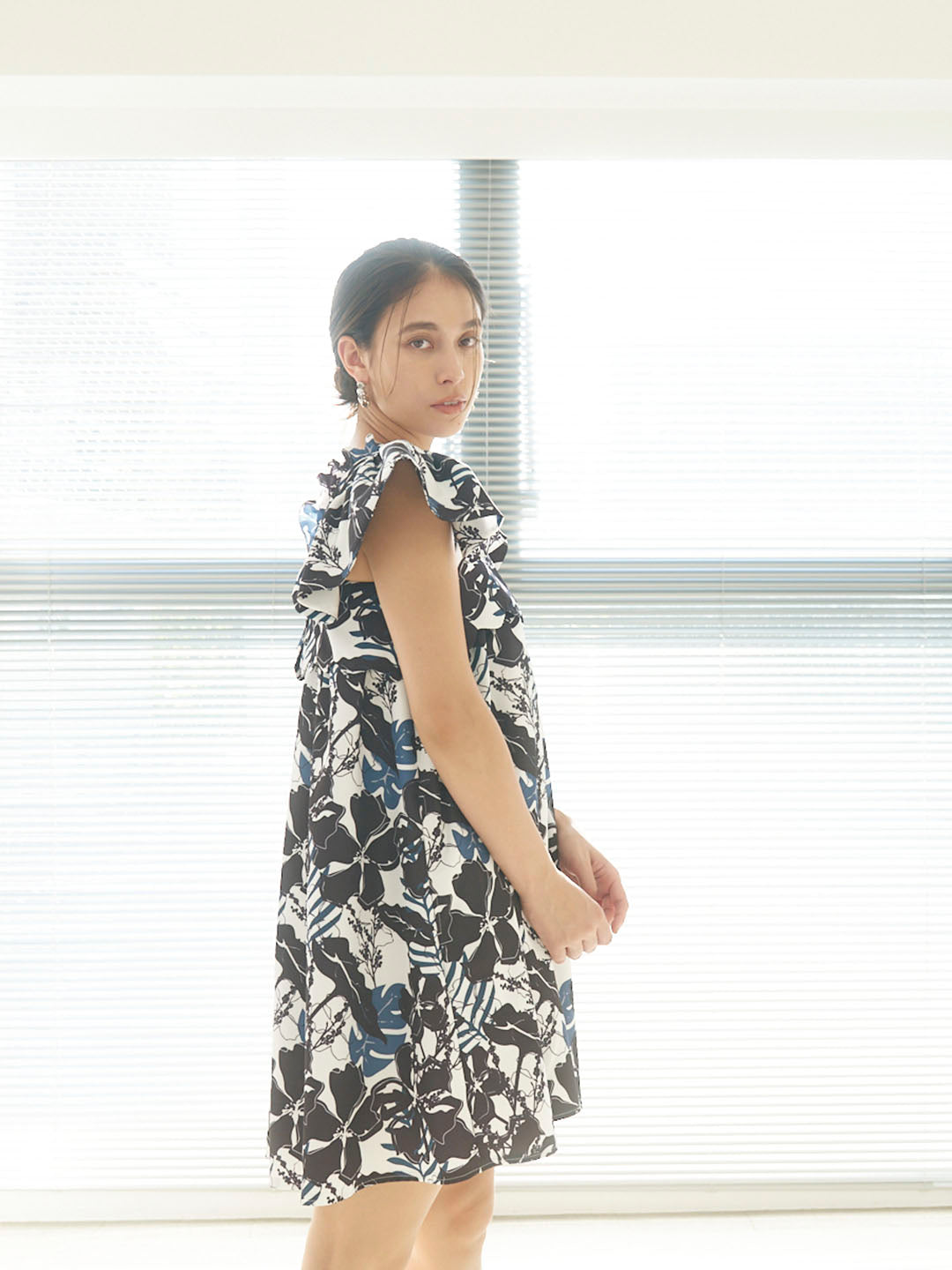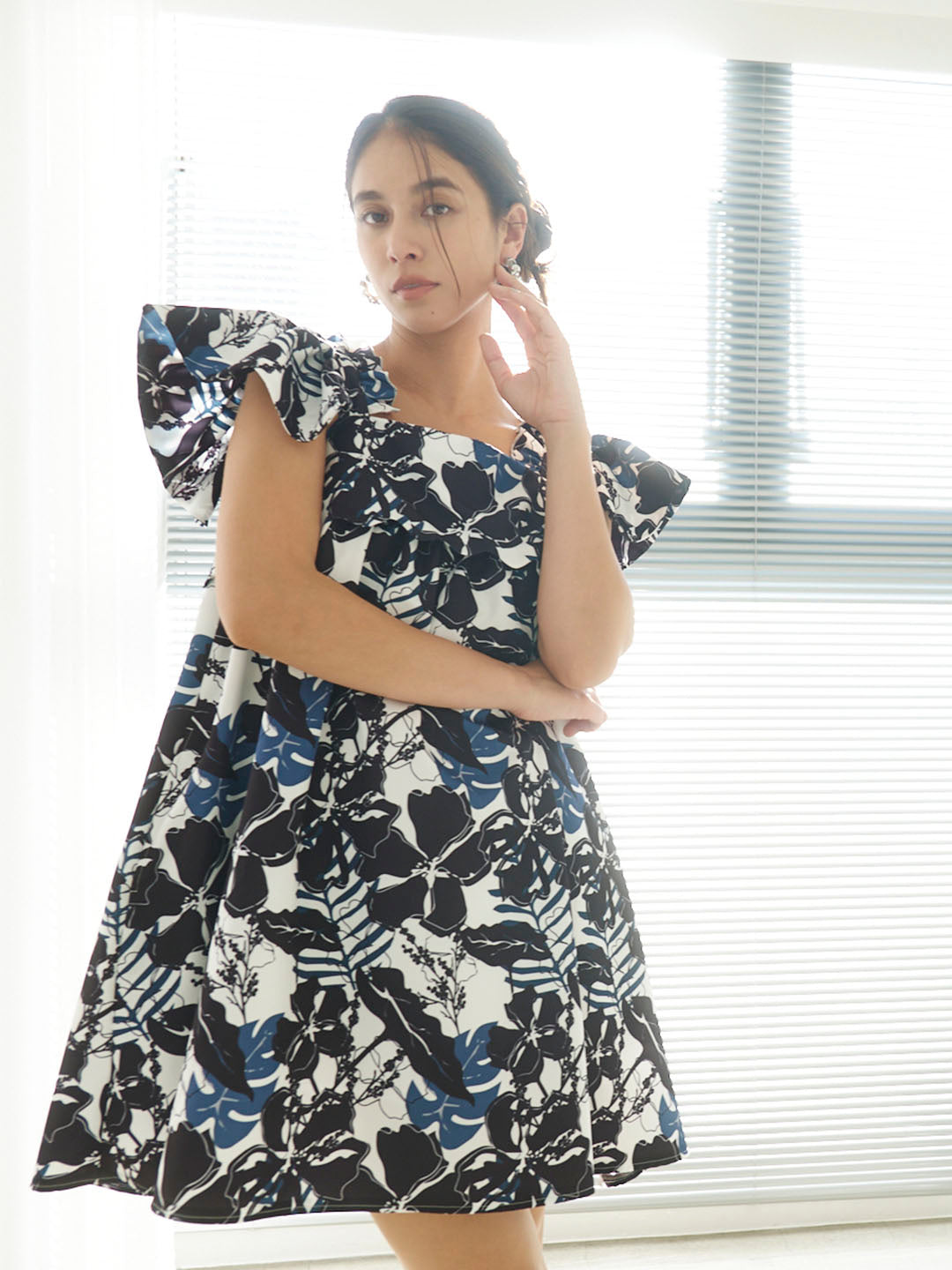 mikomoriオリジナルのフラワープリントが華やかに映えるミニワンピース。 リゾート感のある花柄をモノクロのカラーリングにすることでリゾートはもちろん、デイリーでも着やすくなっています。 胸元からギャザーを利かせる事で、ロマンティックに着こなせるのが魅力です。 ギャザーたっぷりの大きなフリルショルダーは肩から落としてオフショルダーとしても着用できる2WAYタイプ。 サイズ感ゆったりの身幅で体のラインを拾わないラフな着心地です。