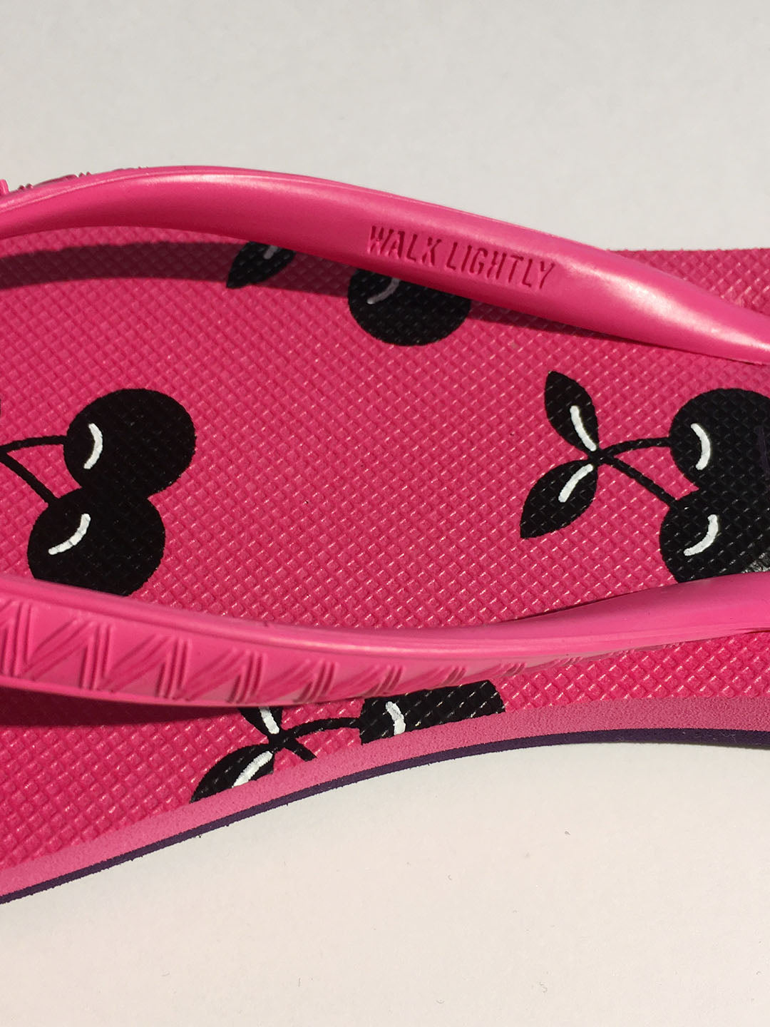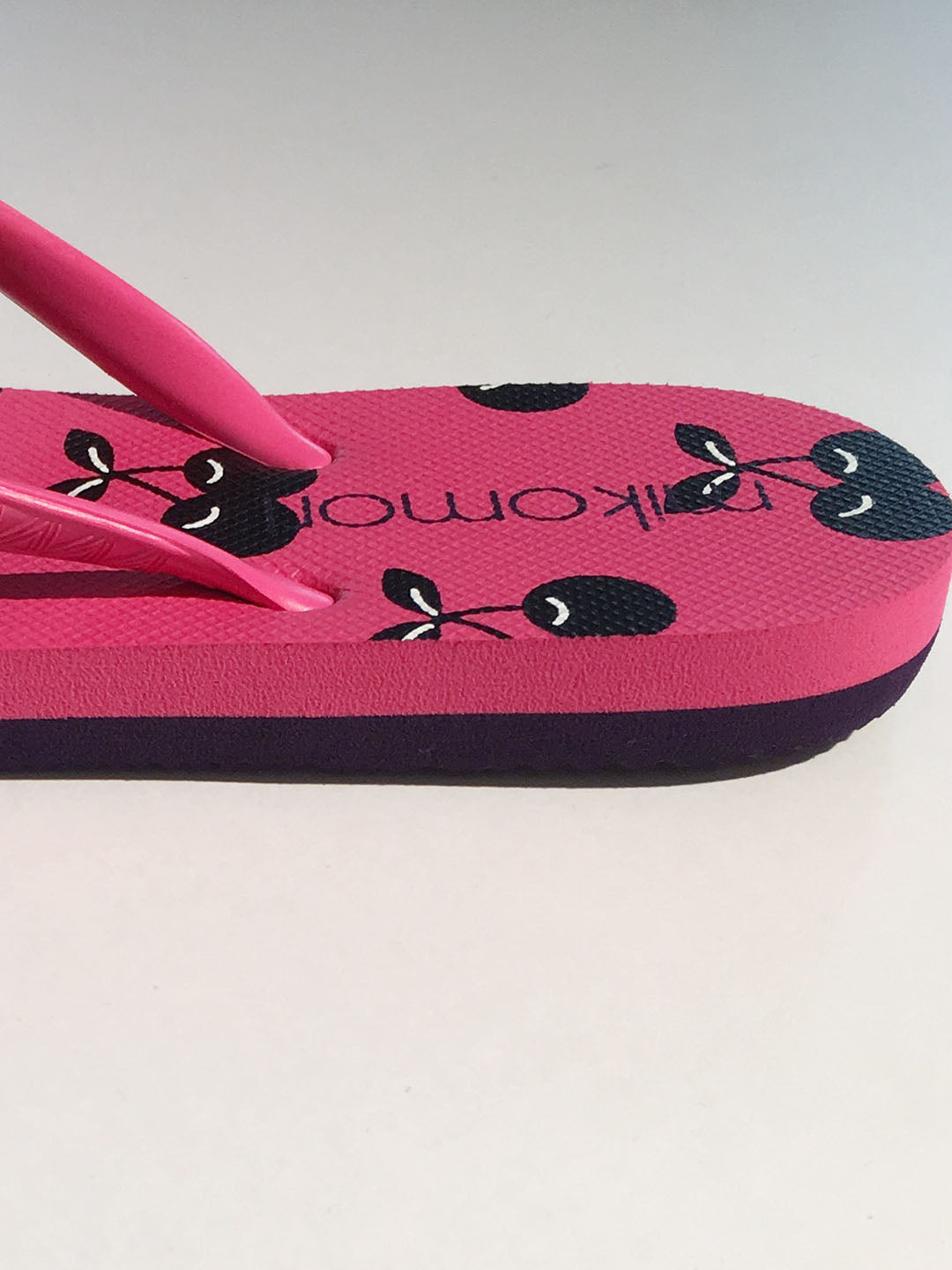mikomoriオリジナルのブラックチェリー柄にフットベッドにはビビットなピンク、ソールには深めのパープルと"らしさ"を全開にインパクトあるデザイン。