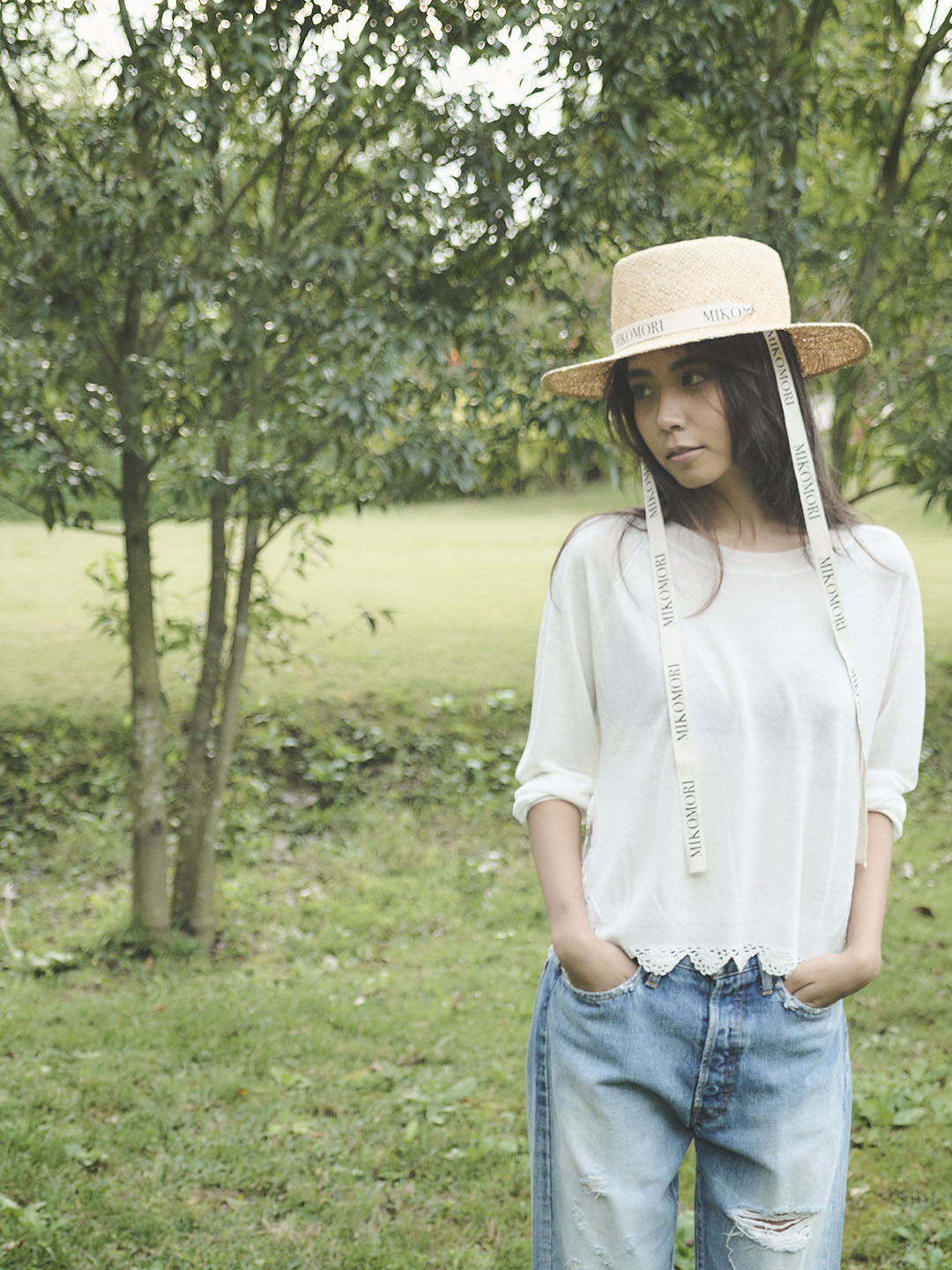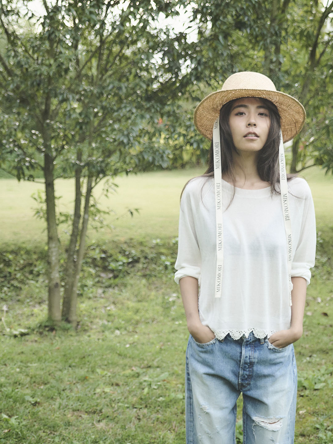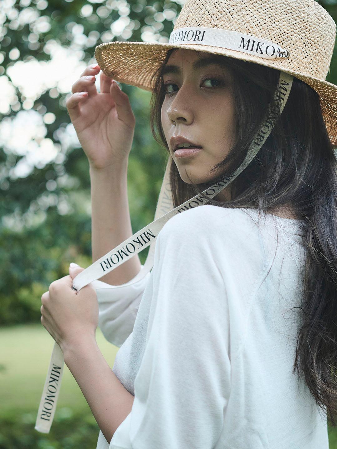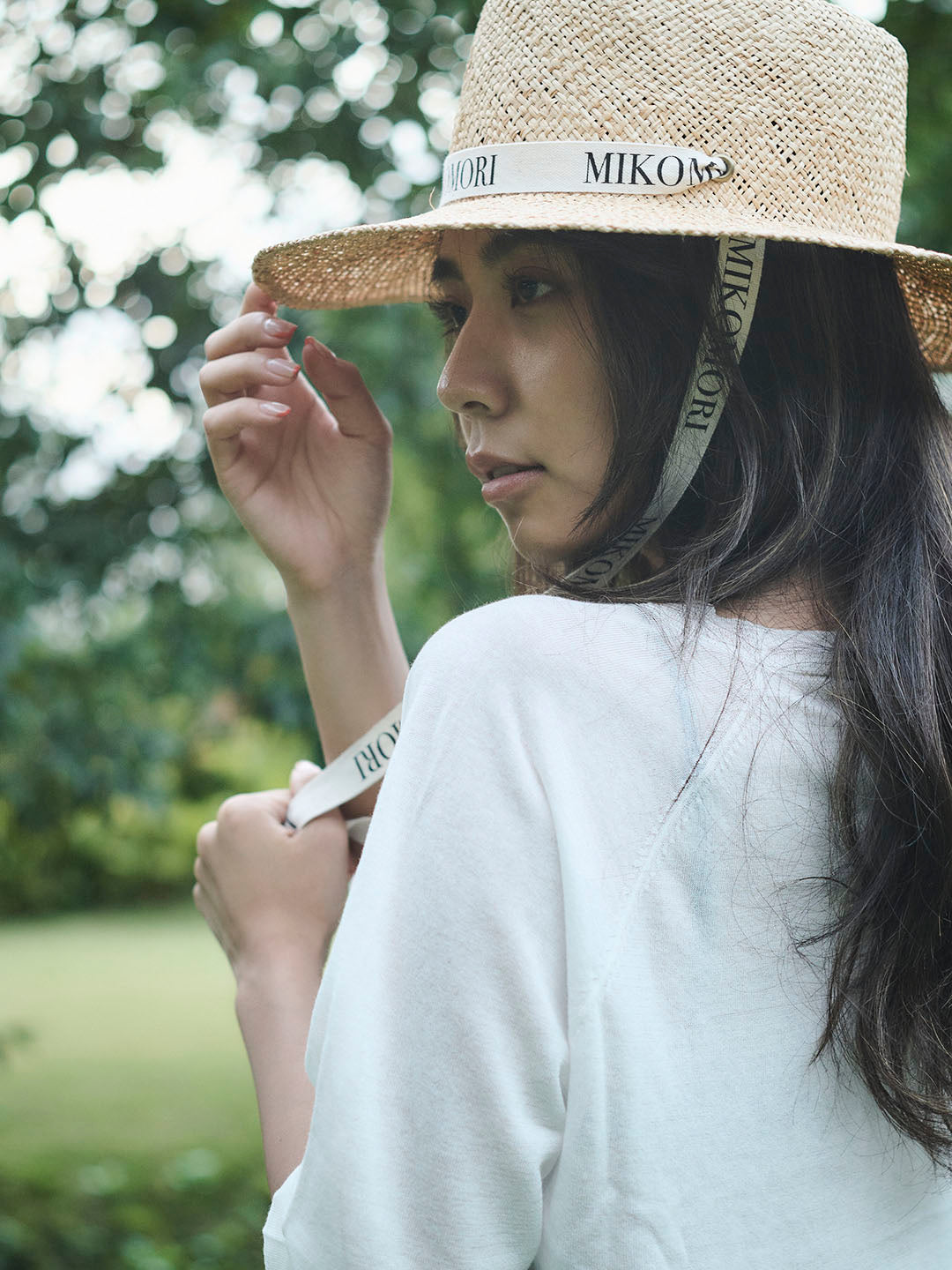 首元が横に広くあいているので、写真のように少し首元をずらすコーディネートはデザイナー安西こずえのおすすめスタイリング!