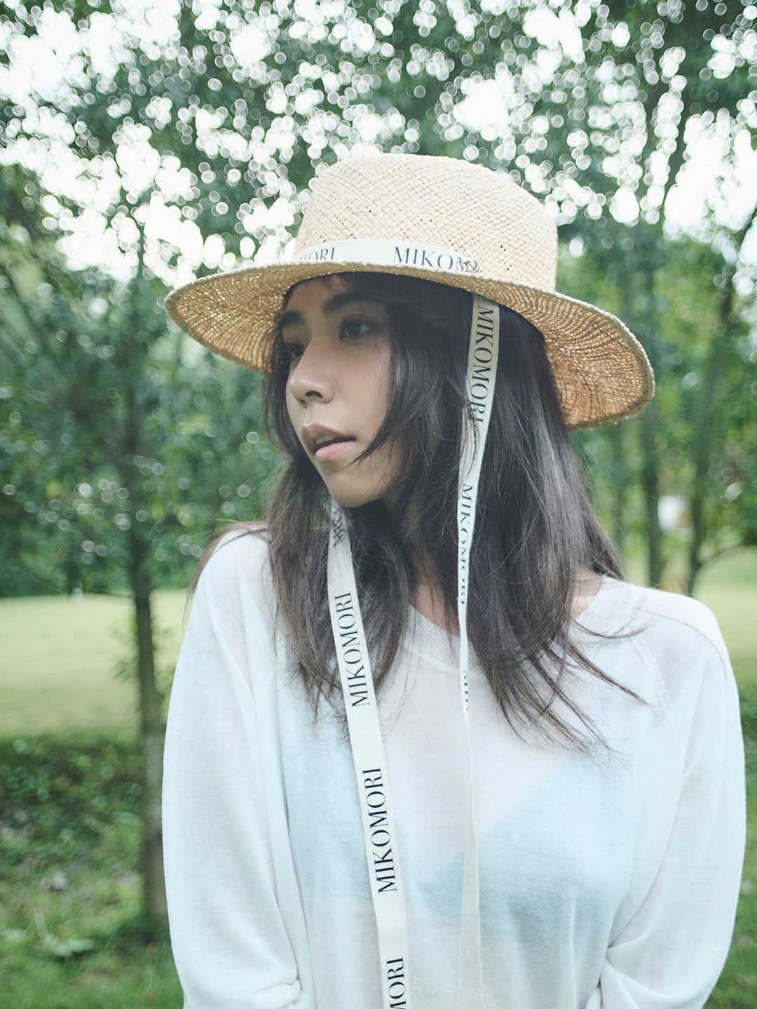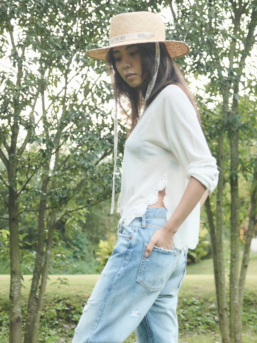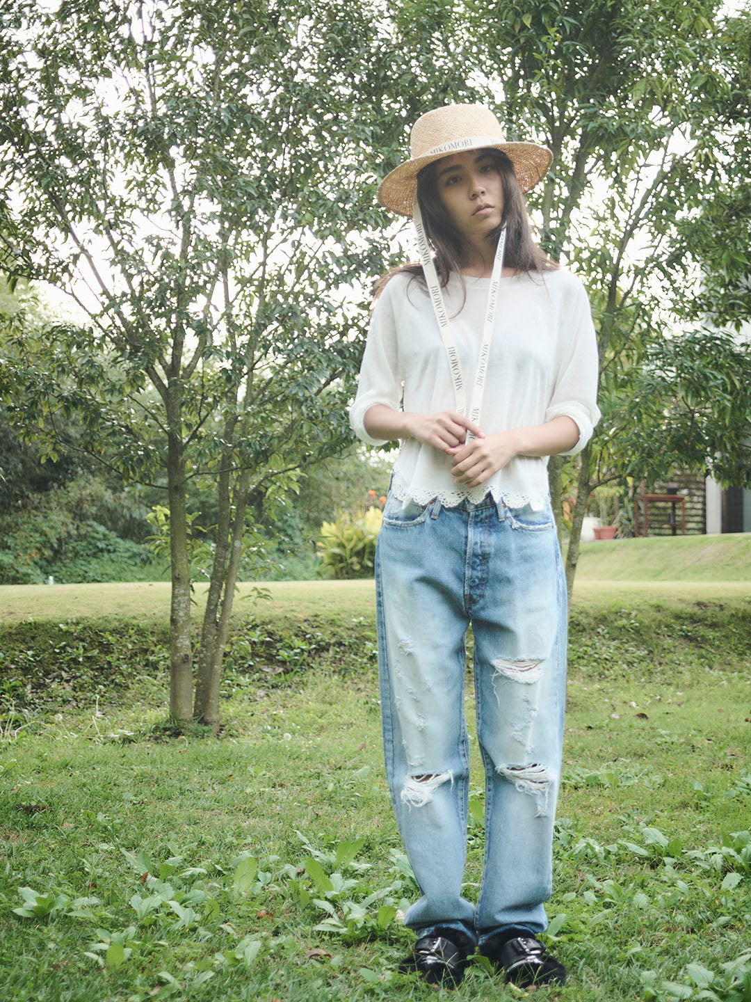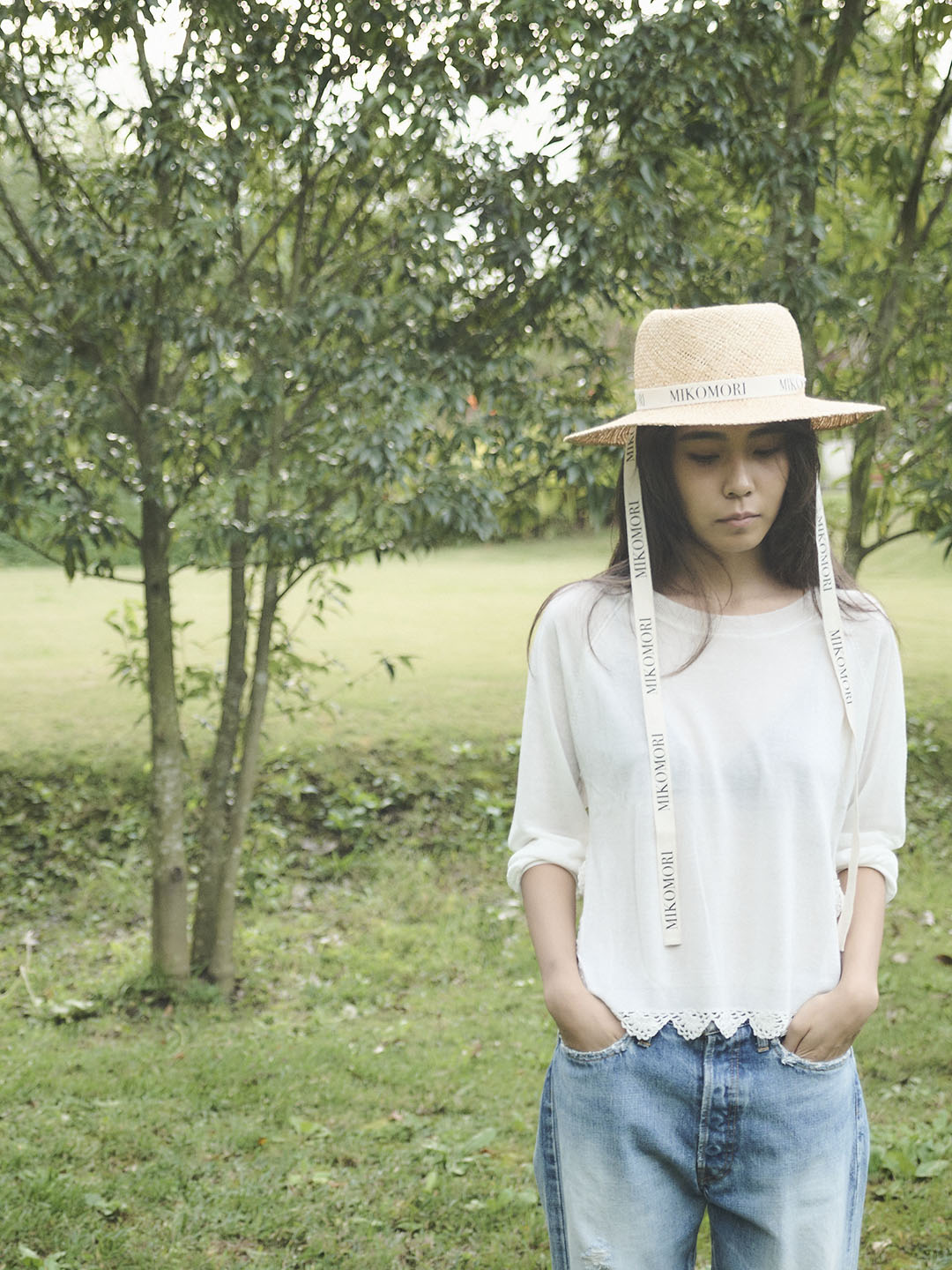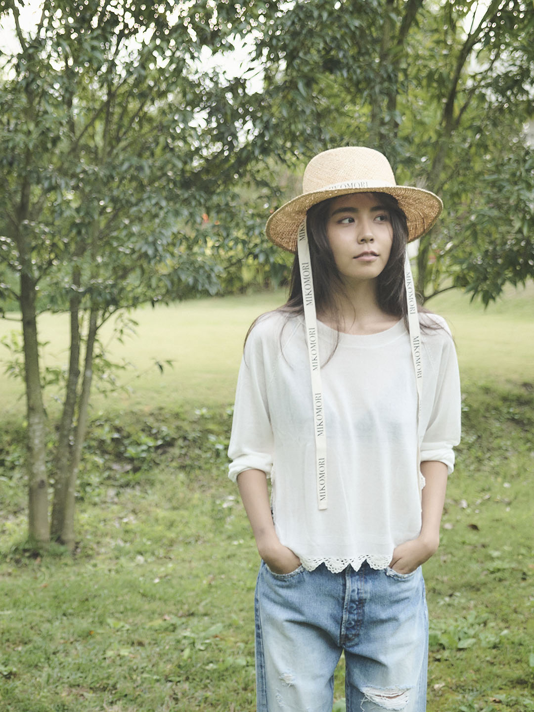首元が横に広くあいているので、写真のように少し首元をずらすコーディネートはデザイナー安西こずえのおすすめスタイリング!