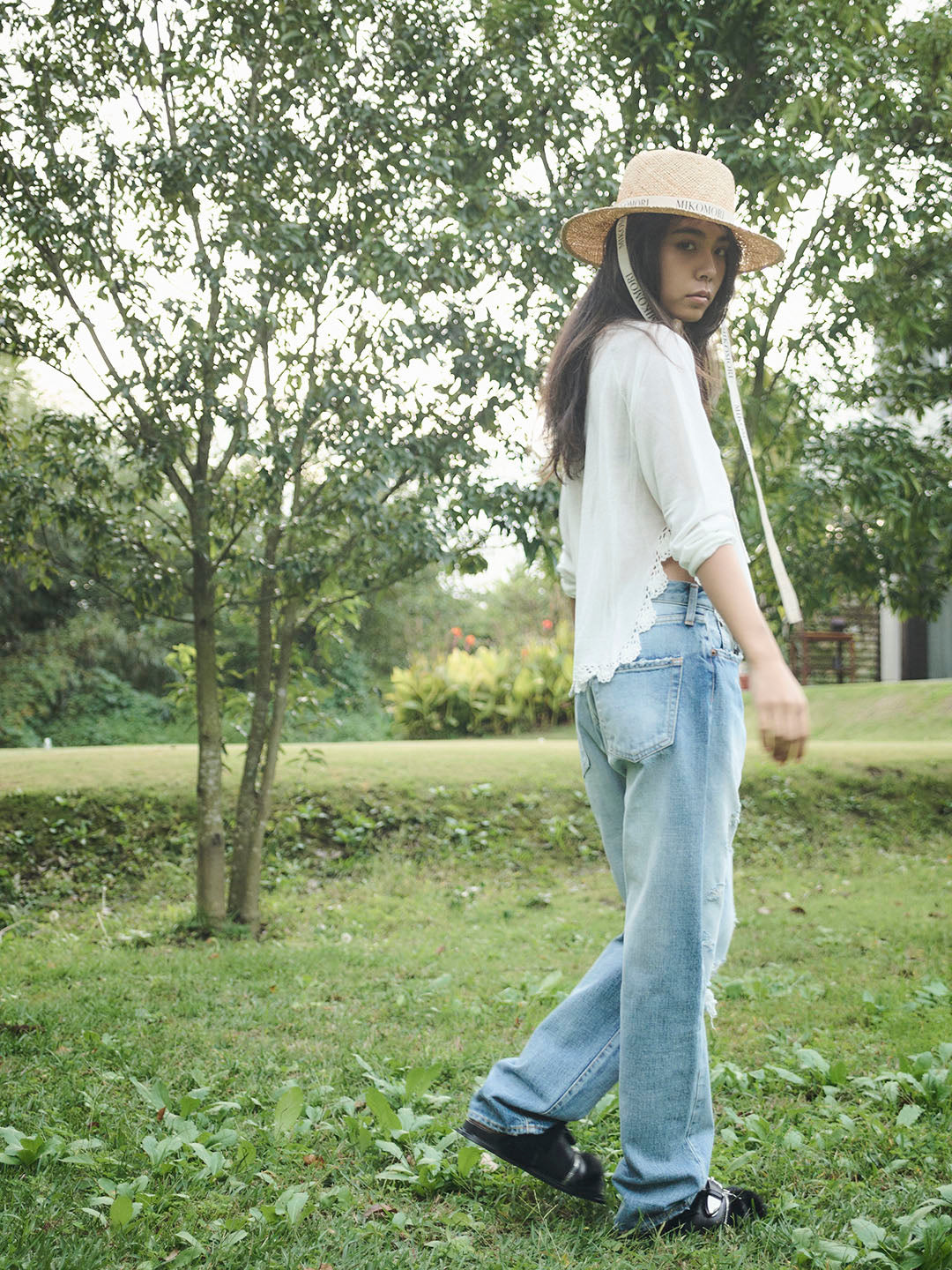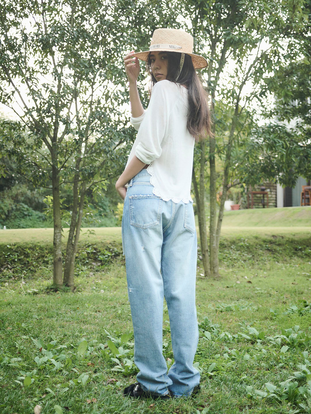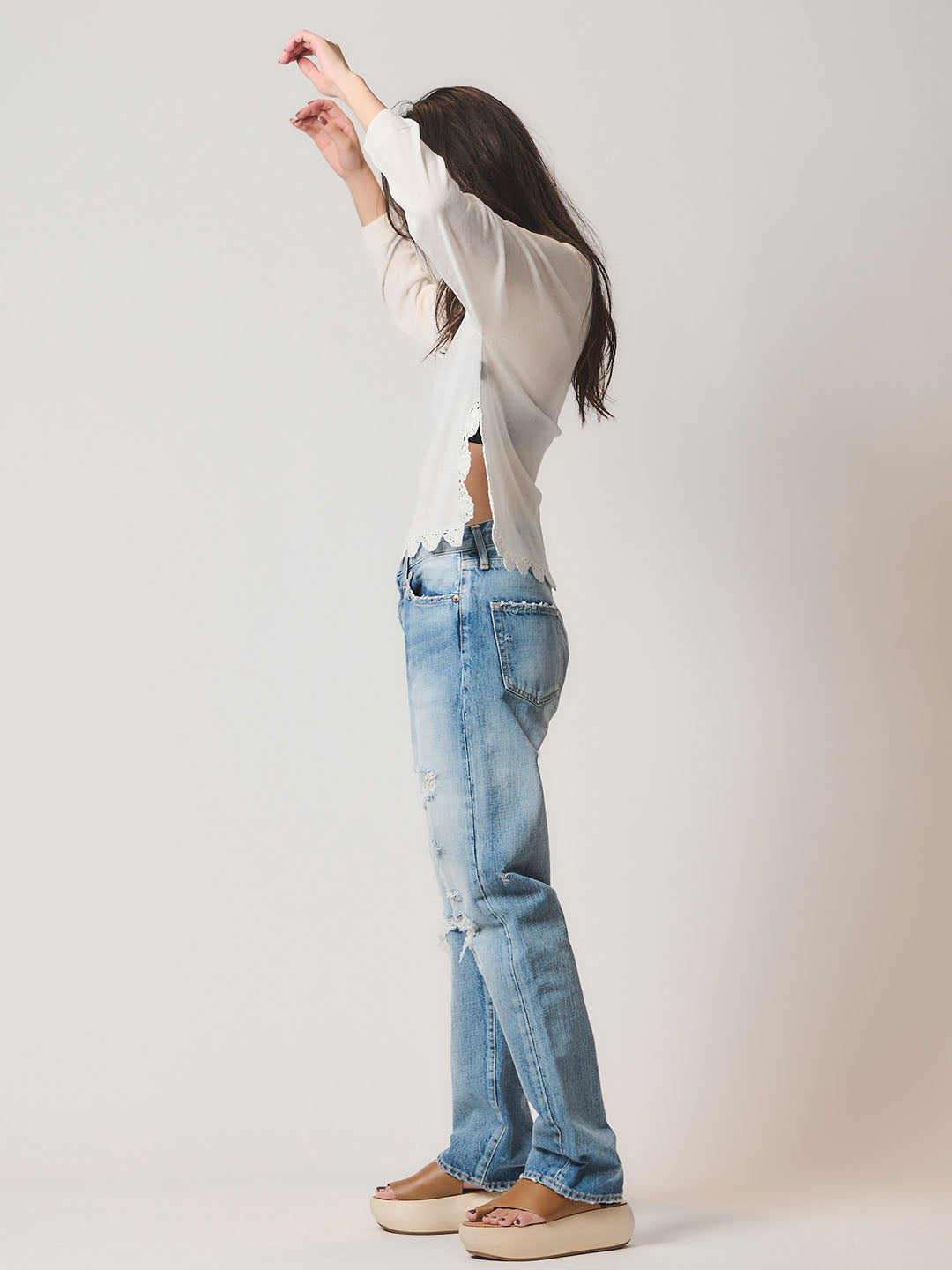 ダメージ加工のデニムとのコーディネートがおすすめです。