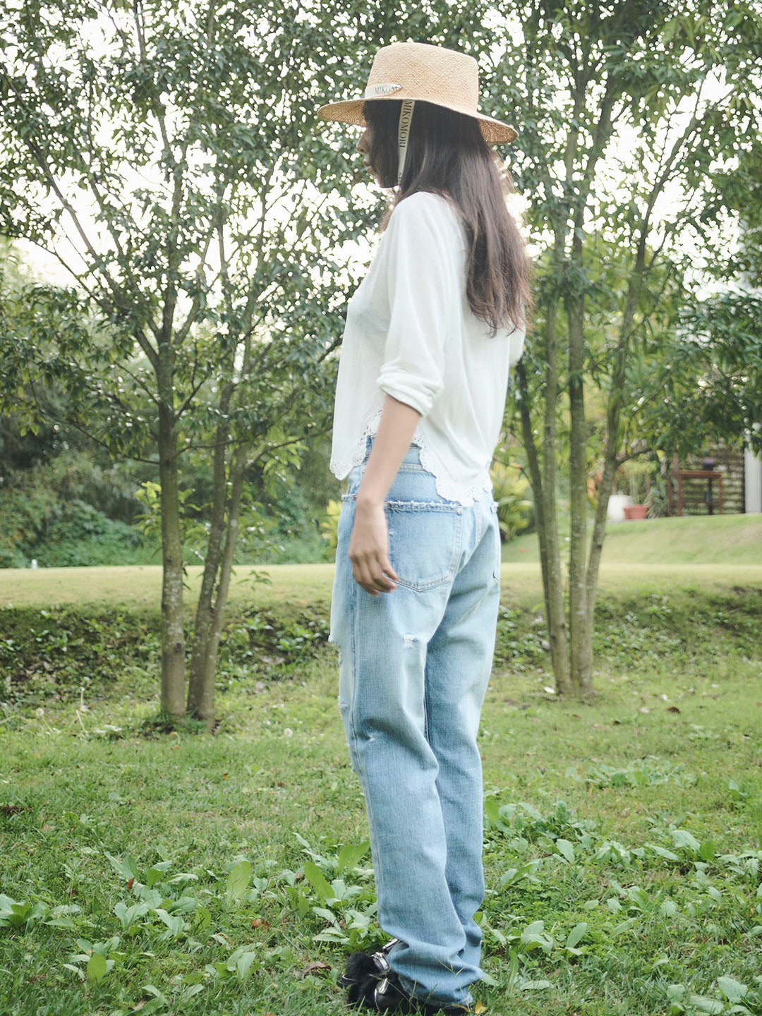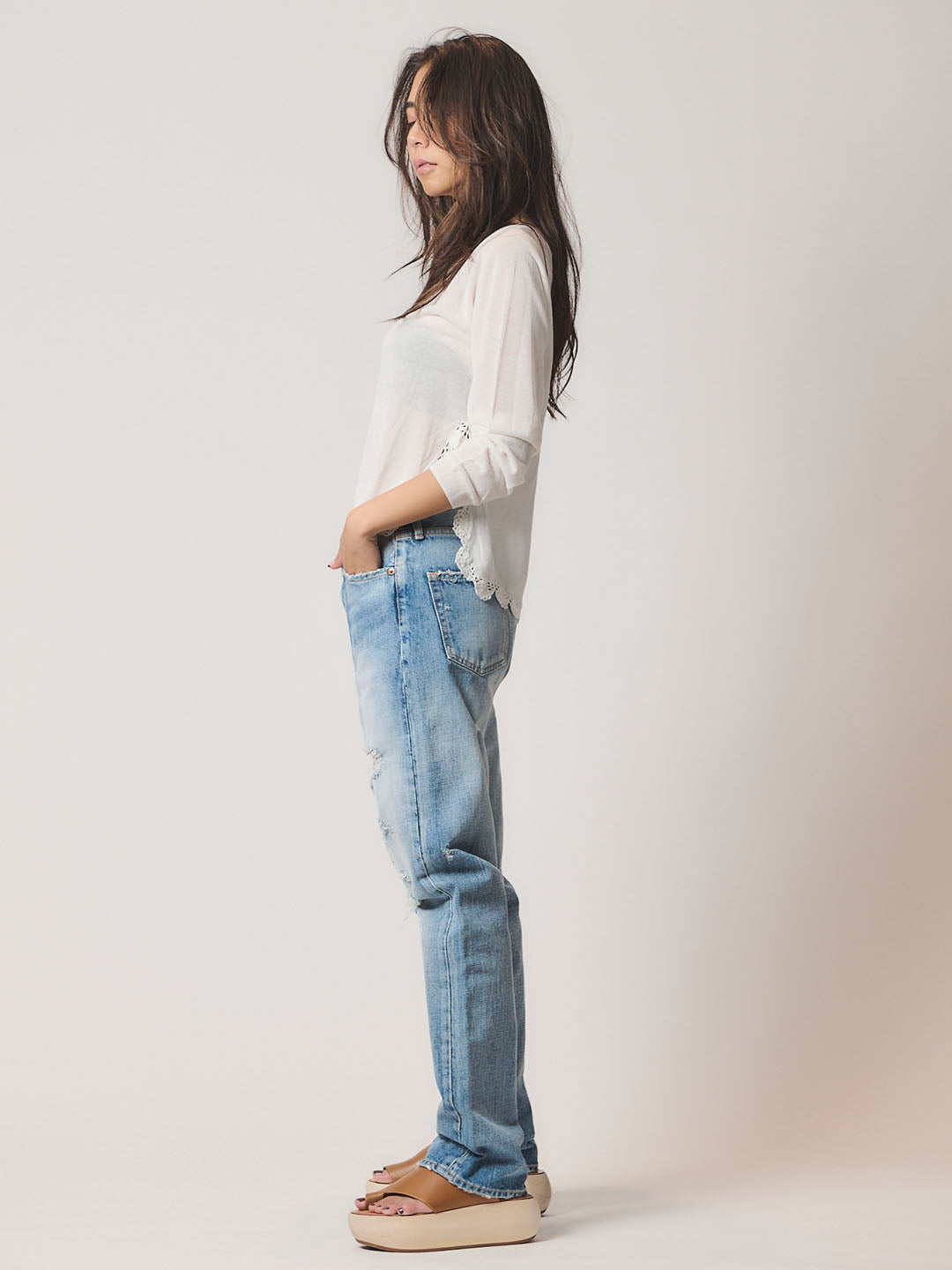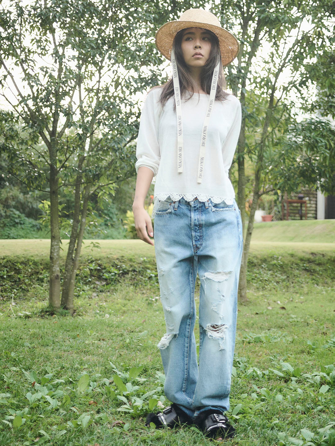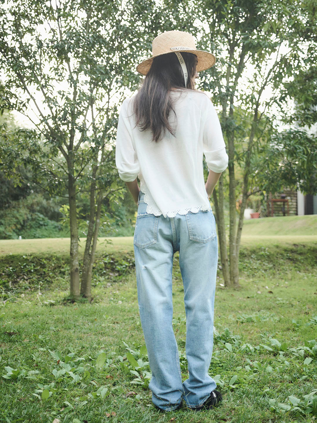 ダメージ加工のデニムとのコーディネートがおすすめです。