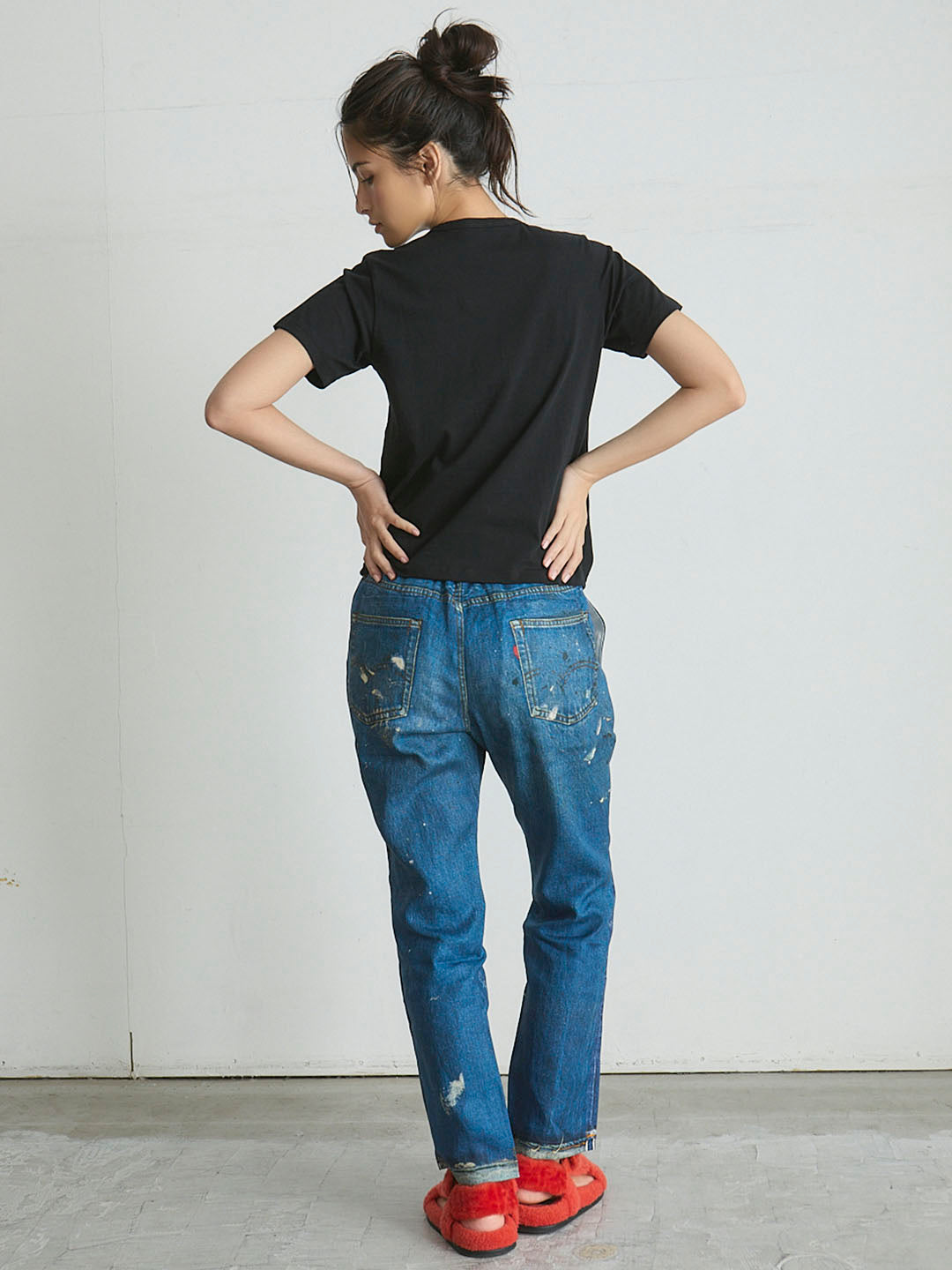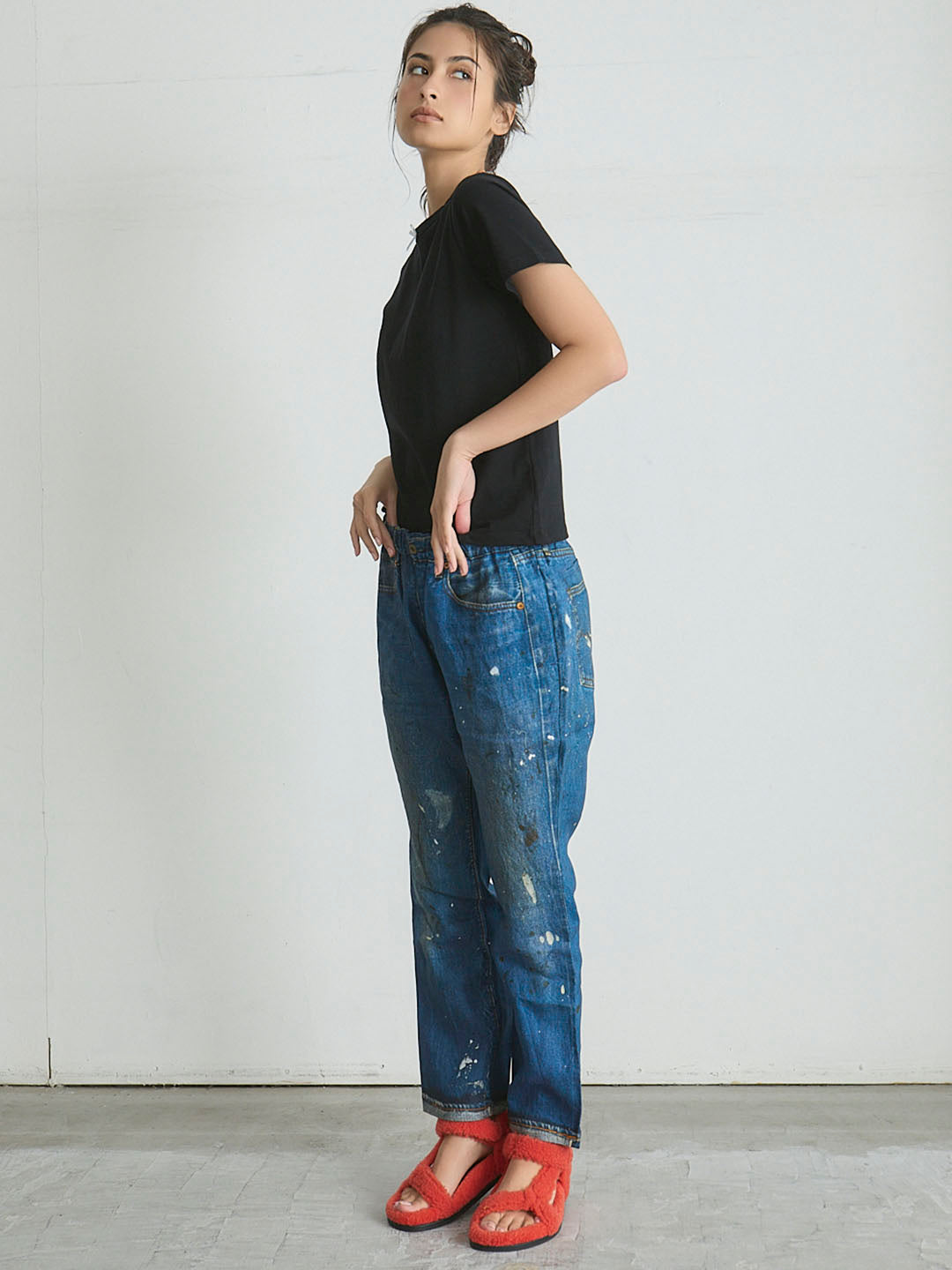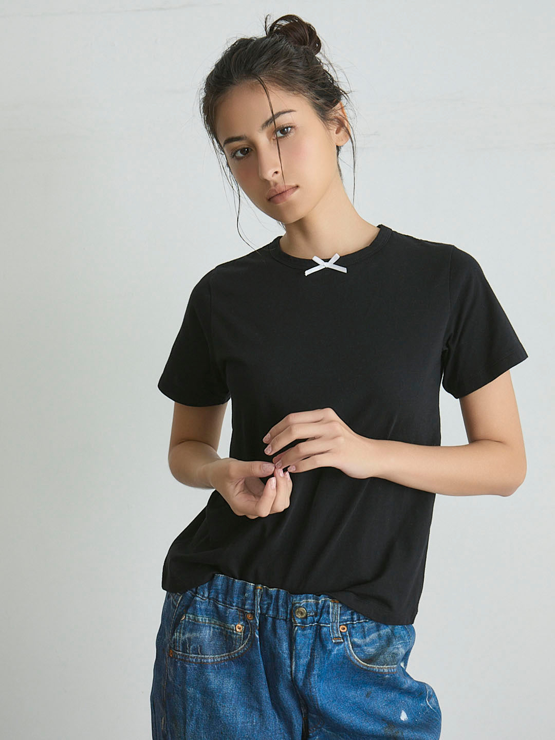 首元にちょこんと添えた小さなリボンがアイコンの、コンパクトなフィット感のTシャツ。 シンプルなTシャツに、ほんの少しの遊び心を効かせた一枚です。