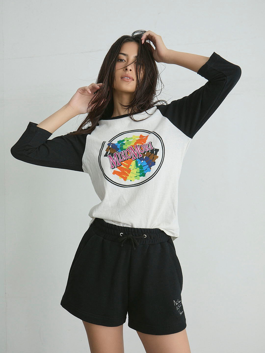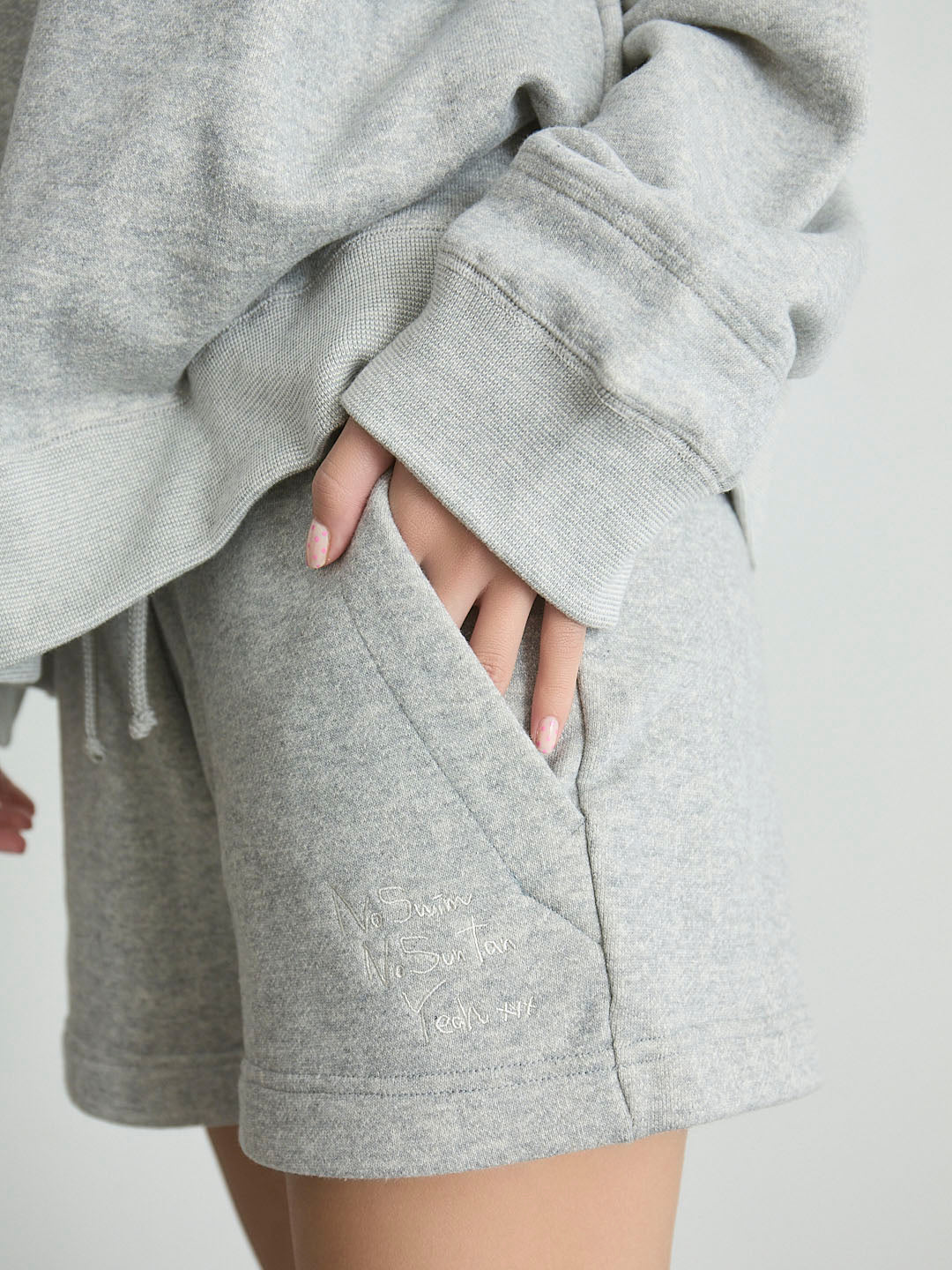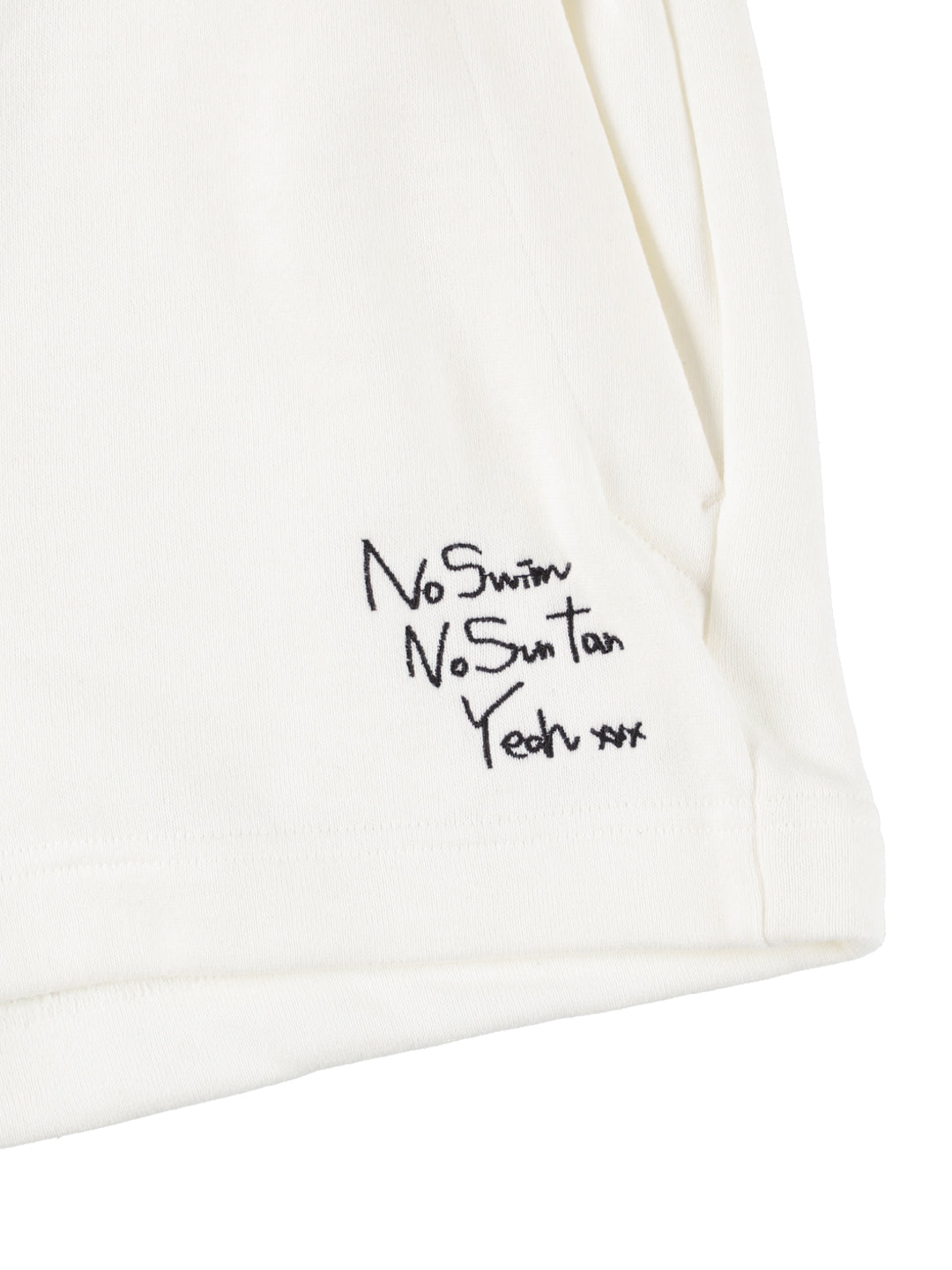mikomori定番のショーツシルエットをベースに、太めのスピンドルを使用し、無造作な結びがこなれ感を演出。左裾には「No Swim No Sun Tan Yeahxxx」の刺繍入り。右裾にはブランドピスネームをあしらいました。