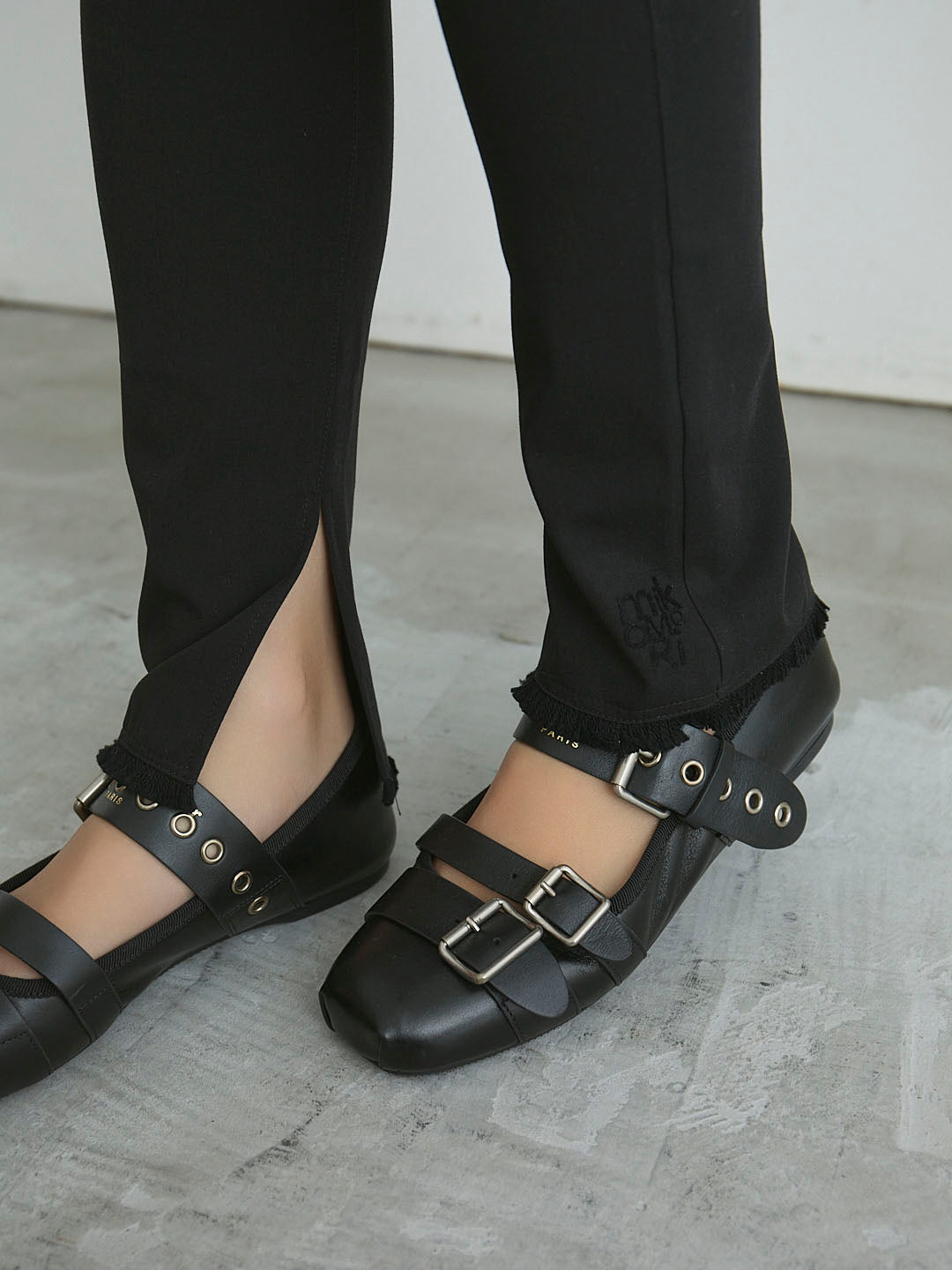 裾には小さなスリットとフリンジ仕上げ、さらにmikomoriのフロッキーロゴをワンポイントでプラス。 ベーシックなアイテムながら、足元にさりげないアクセントが効いたデザインです。