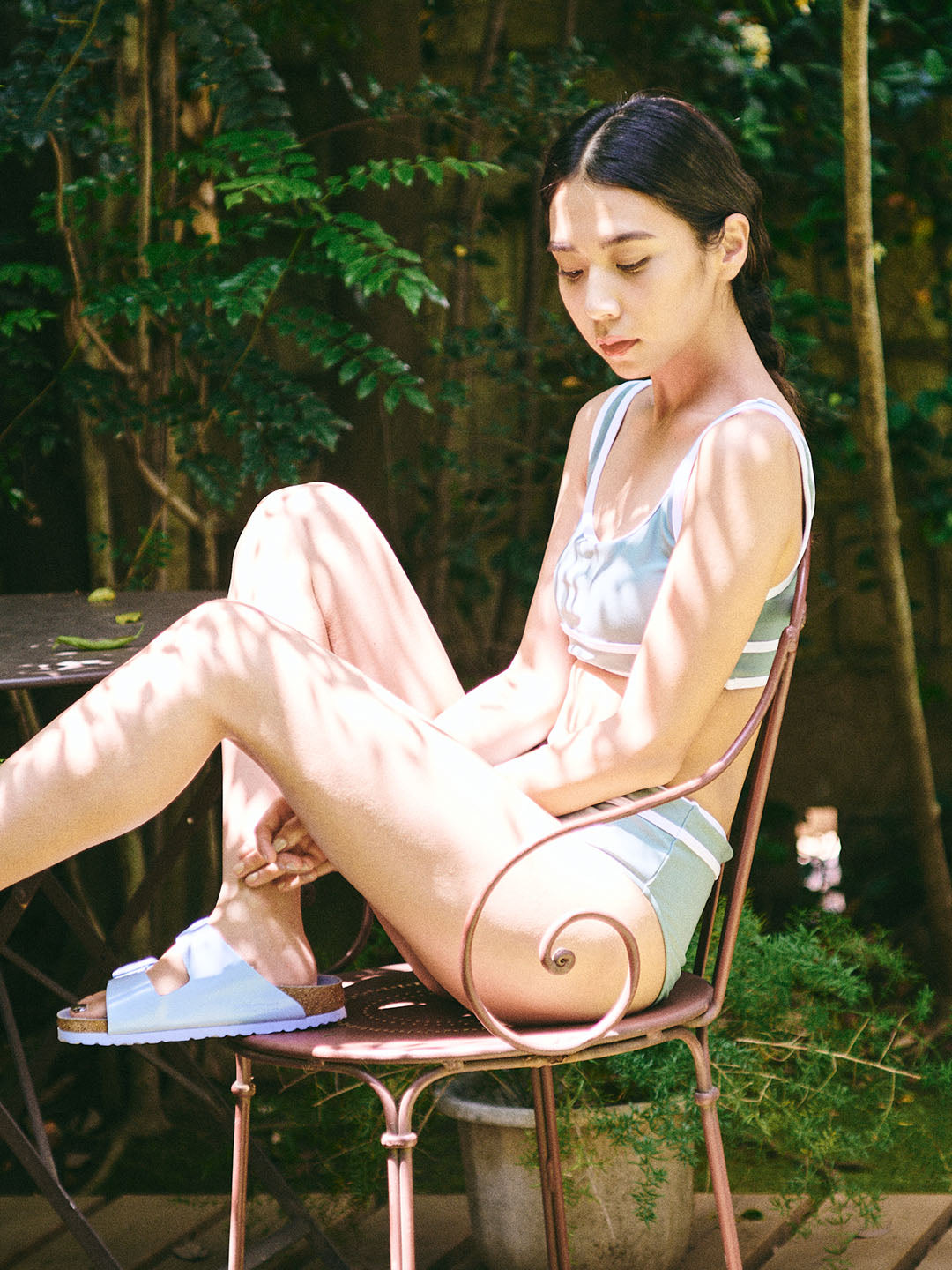 緑と白のコントラストが印象的でスポーティでも遊び心のあるデザインに仕上げました。ハイウエストなので脚長効果も期待できるのも嬉しいポイントです。